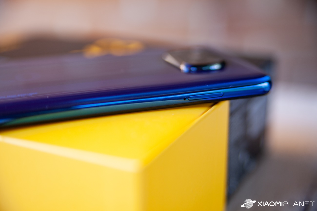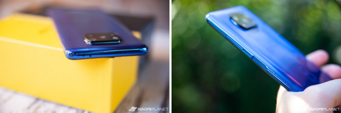 뒤쪽 폴리카보네이트 쪽은 아직 남아 있습니다. 광택이 나며 제조자 이름 POCO와 재활용 정보를 가진 매우 독특한 색상의 스트립이 포함되어 있습니다. 상단에는 4개의 카메라 중 돌출된 모듈이 있는데, 원형이 아니라 불규칙하다. 또한 모듈에는 LED 플래시가 포함되어 있으며 보호 커버와 정렬할 수 있습니다.
